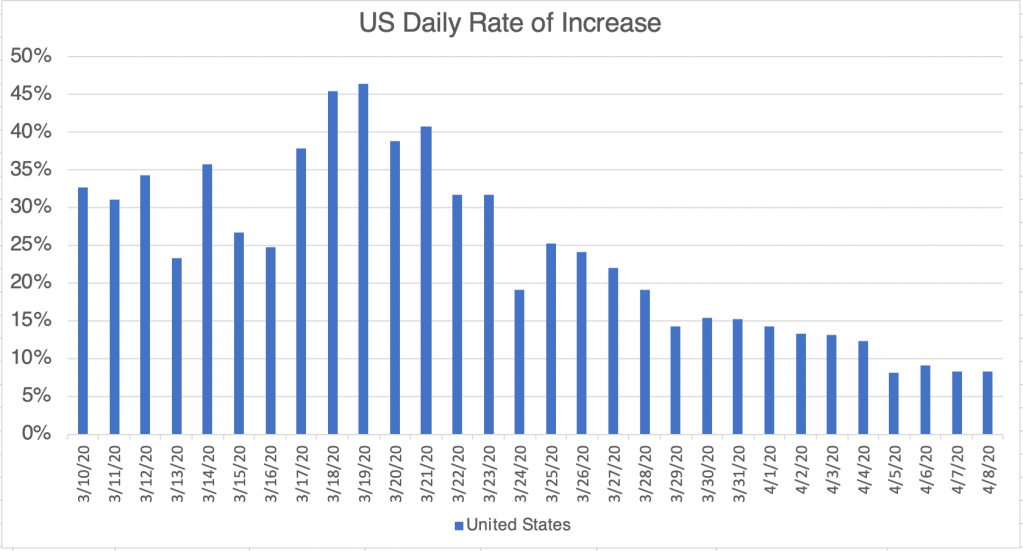 You may have heard lots of positive news in the press in the last few days about new lower rates of new infections in the US. If you saw my posts on March 30th and April 1st, you know that I was enthusiastic about some good news a little earlier than was warranted. So I wanted to wait a few days to see if the current positive trends would hold.