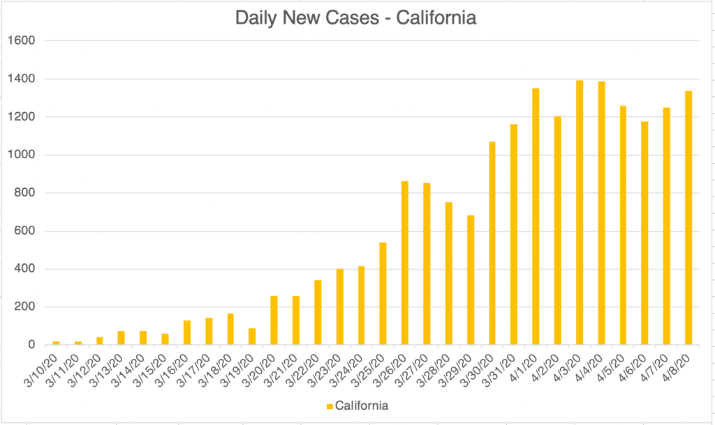 All that being said, I do have good news for you today! For the World, the US, California, and San Diego County, the rate of new cases as been below 10% every day since Sunday, April 5th! That’s great news. The actual daily new cases has been trending basically flat in the US since Sunday, and in California since April 1st. So the news is definitely good! There is even better news if you live in San Diego County. Daily new cases actually appear to have peaked on April 3rd, and are actually down since then.