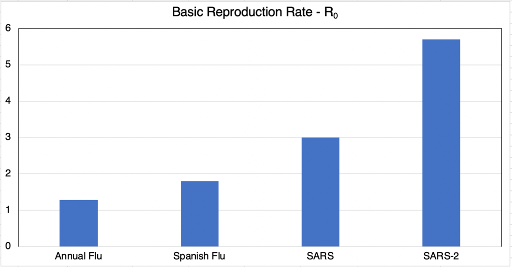 The bad news isn’t really new, but rather a new study of the Basic Reproductive Number (R0). This number is a measure of infectiousness and is an attempt to calculate the average number of people that an infected person will pass the virus to. For a typical flu, this number is 1.28. For the first SARS virus in 2002, it was around 3. As recently revealed in a pre-publication paper [Sanche et al. High Contagiousness and Rapid Spread of Severe Acute Respiratory Syndrome Coronavirus 2. July 2020, pre-print captured April 13th, 2020. Em. Inf. Dis. 6(7)], the actual R0 value is 5.7, twice as high as originally thought, and 4.5 times more infectious than the typical flu.