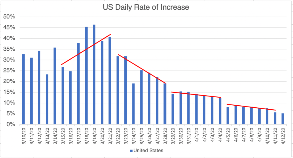 I have another good news/bad news post for you today. First the good news. Yesterday, 8pm on April 12th, the rate of new infections for the world, the US, California, and San Diego County, were all below 5%! Our efforts are paying off!