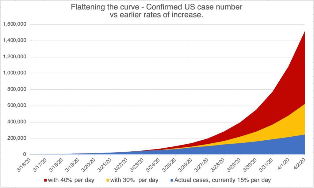 Is our isolation helping? In mid-March, the rate of increase of new confirmed cases was around 40%. Yesterday it was around 15%. I made this graph of what the case load in the U.S. MIGHT have been if we were not in our homes.