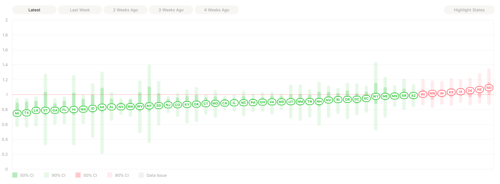 Mark Rasmussen sent me a link today that you’ll be interest in. It’s a new site that tracks the Effective Reproduction Number, Rt.