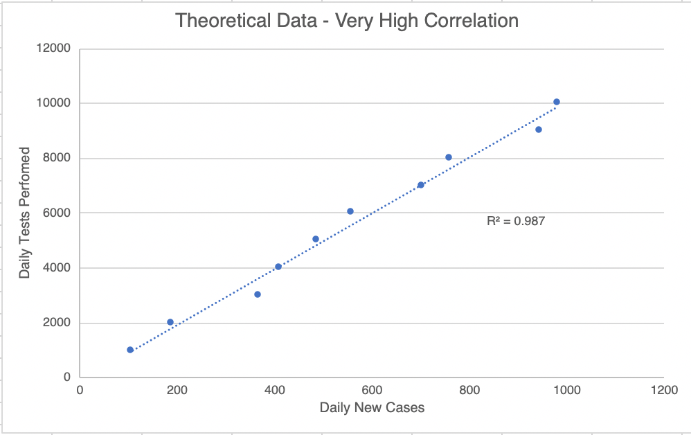 How many real new cases? This is going to be a little mathy! I told you I was going to start tracking the number of tests, and I have been doing that since April 27th. This will help us know how many of the new cases are just because of more testing, and how many are actual new cases. I’ve plotted the new cases against the new tests. For each day, a point comparing the new cases and new tests is shown. If new testing matters, then a day with a high number of tests will also have a high number of new cases. To find out if this pairing exists, we can do a statistical test called the R2 test (pronounced “R squared”, also called the correlation coefficient). This test creates a best fit line with the data and that creates an R2 value. This value is a measure of how well the 2 parameters (new tests and new cases) are correlated. I show a hypothetical graph in which the 2 sets of data are well correlated. A perfect correlation will have a score of 1.0, while a set of data with no correlation at all will get a score of 0.0. For scientists (at least the ones in diagnostics, like me) a correlation is considered “true” if the R2 value is above 0.95. You could also say that the correlation is 95% likely to be true.