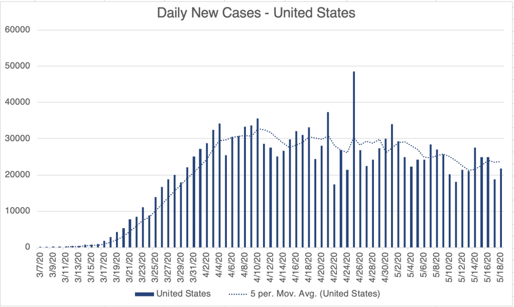 This is a case update for the previous week. As we’ve seen before, new cases in the US are slowly trending downward (currently around 21k confirmed cases per day), slowly trending upward in California (around 2k confirmed cases per day), and flat in San Diego County (around 125 confirmed cases per day). As we discussed from statistics last week (May 12th post), many of these are likely real cases, and not just because of additional testing.