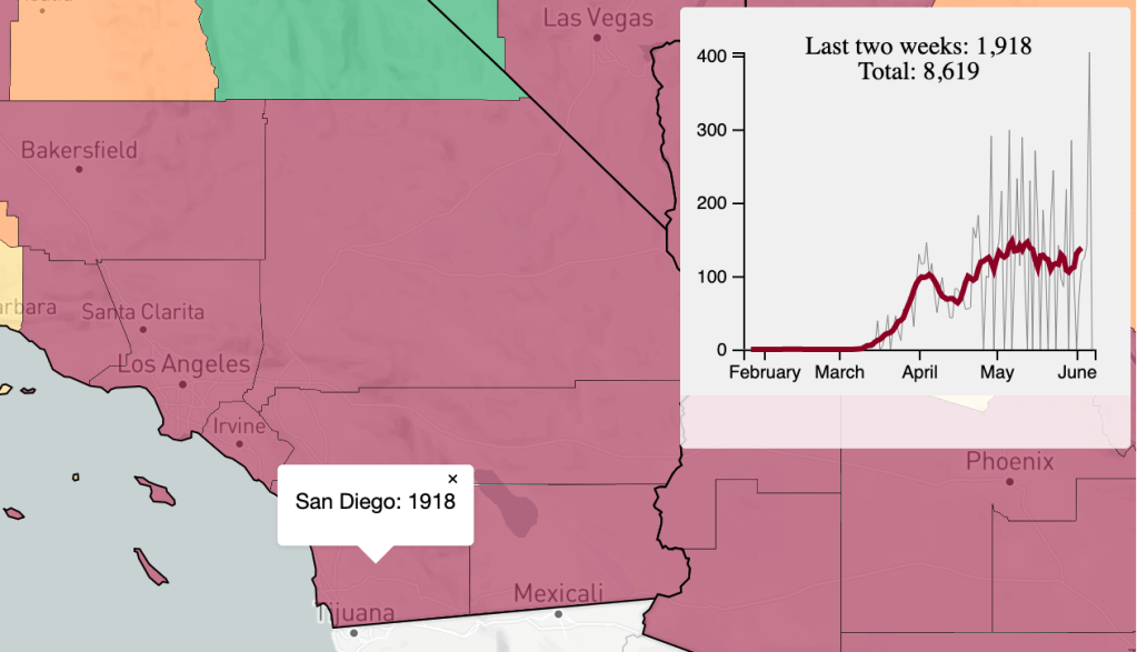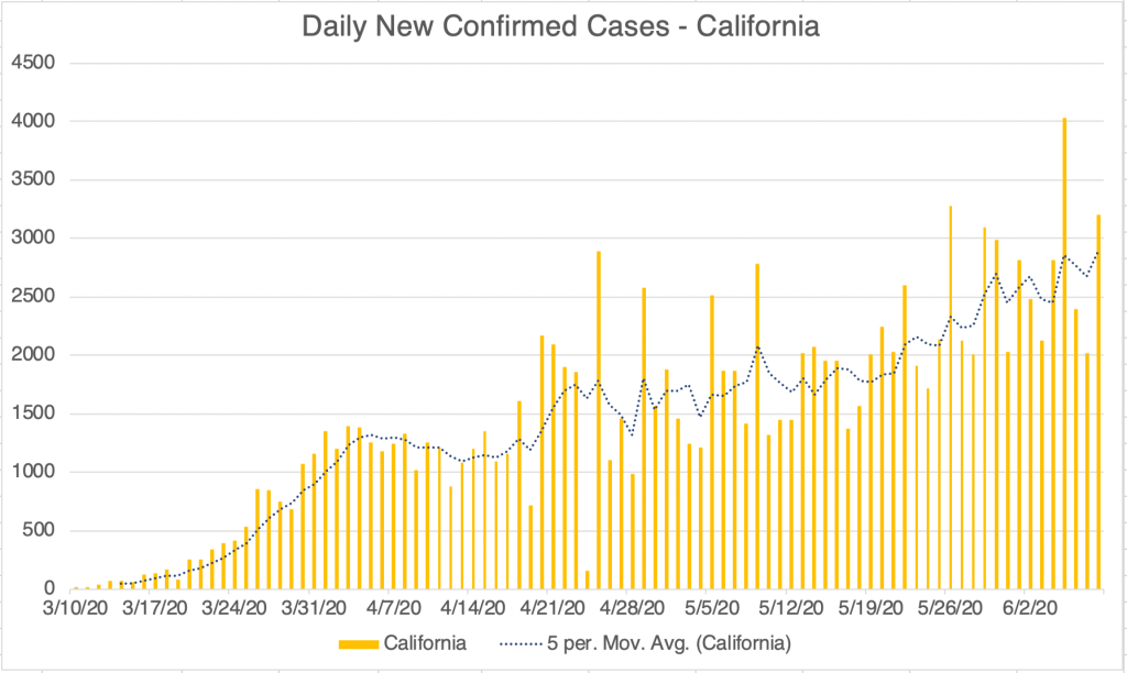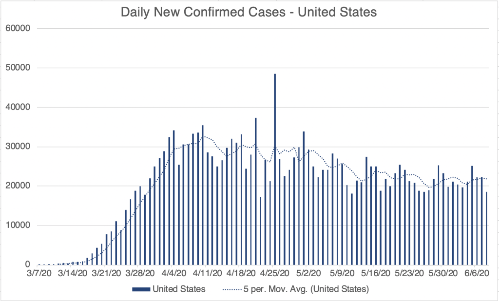 Here’s the weekly update on the virus. As I predicted in my June 2nd post, we’ve started to see an increase in cases, at least for areas that I closely monitor. For the United States as a whole, the increase has been subtle, really just a flattening of a steady downward trend. For California and especially San Diego County, there has been a pronounced uptick in cases during the last week. The City of San Diego had some protests last weekend, but not nearly as much as in other cities like Minneapolis, NYC and LA. If the pattern for San Diego holds for other cities, they will experience more severe increases in cases. Oddly, many in the media strongly discouraged protests in favor of re-opening, but are seemingly promoting protests about police brutality without regard to precautions like mask wearing. Even the WHO is encouraging mass protests. Of course there are good reasons to attend a peaceful protest. If you go to a protest, please wear a mask. Of course, I have to discourage you from attending a riot.