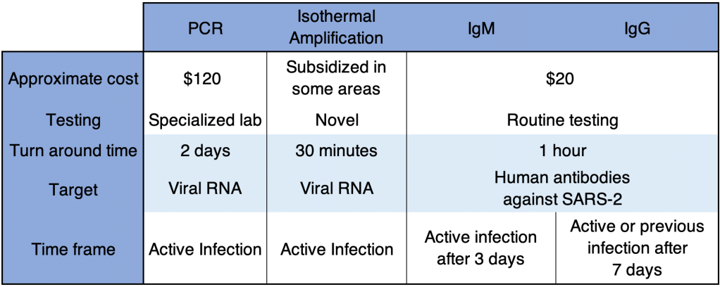 Isothermal amplification: The Abbott ID Now COVID tests uses this relatively new technology. These tests are similar to PCR and are both sensitive and very fast.