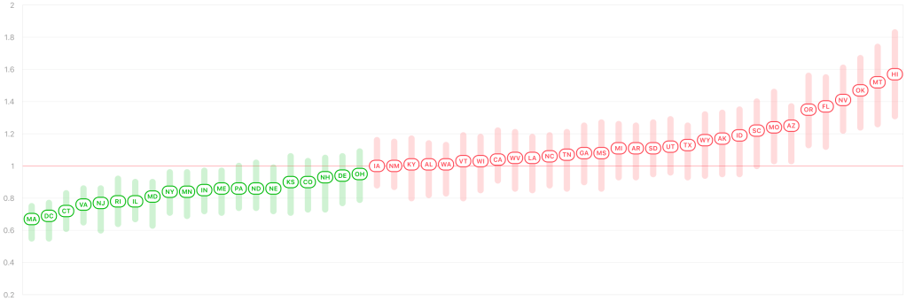 Rt Live reports that 29 of 51 listed US states and territories have an Rt of above 1.0, suggesting that the virus is spreading in those states.