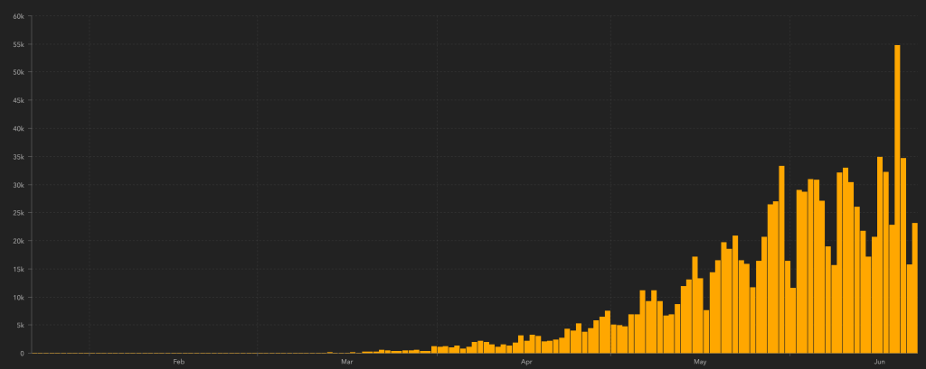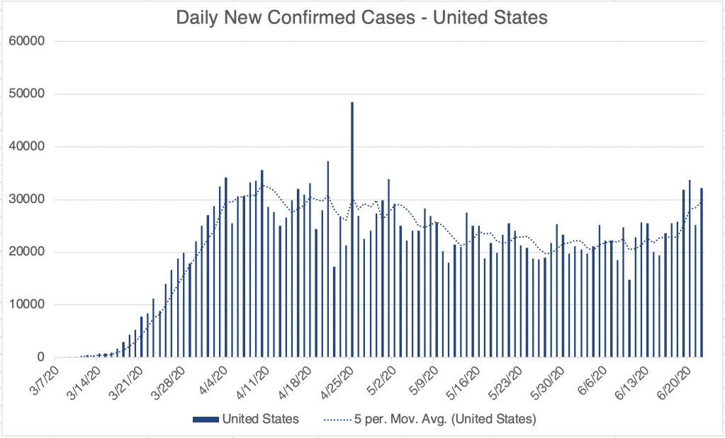 Internationally, Brazil just crossed the 1 million confirmed case mark, and is #2 in total confirmed cases behind the US. Brazil’s new daily cases may have hit it’s peak, however, so new cases may finally be slowing down. Russia and India are next in total cases.