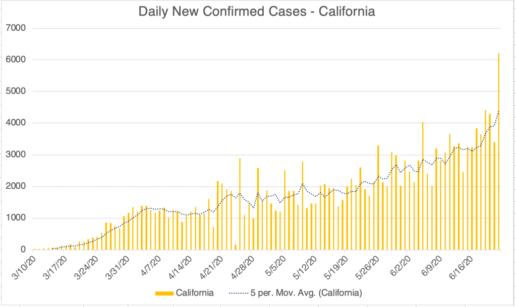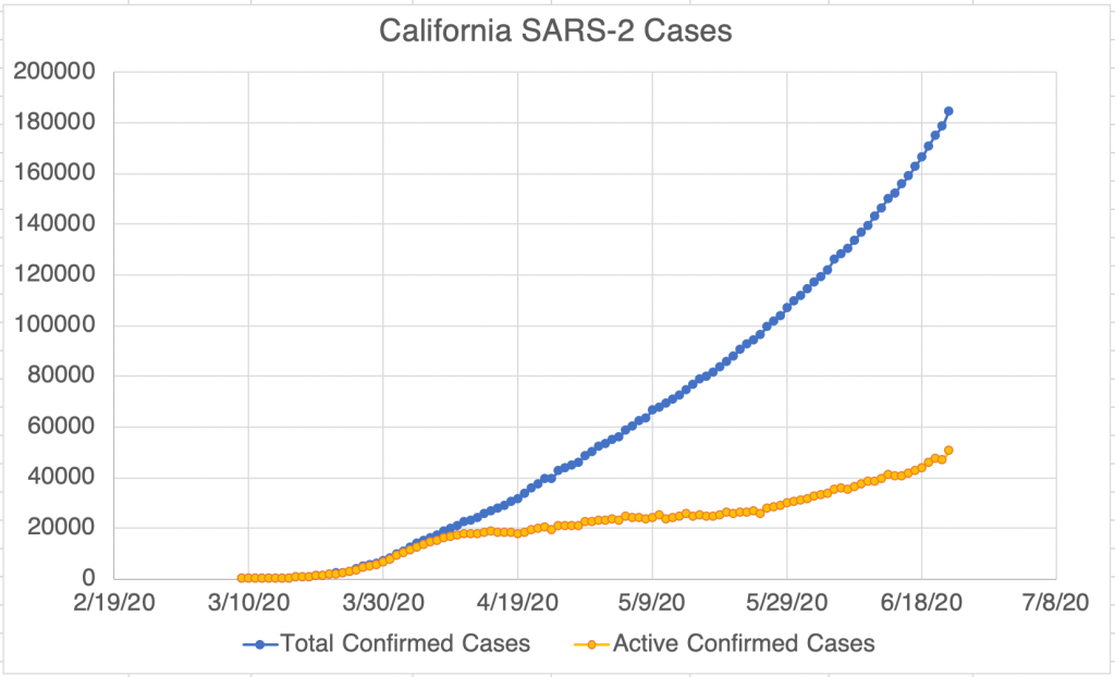 This is a Coronavirus case update. New confirmed cases continue to climb for all three regions that I monitor closely, the US, California, and San Diego County. Calculated active cases in California are now at approximately 50,000 active cases, up from 20,000 at the height of the first peak in early April. Los Angeles County continues to dominate the caseload, with 51% of total confirmed cases in LA County.
