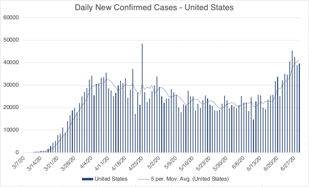 Why is this happening? Probably for multiple reasons. First, as things re-open, some businesses and individuals are not following guidelines for safe reopening. San Diego County had 7 super-spreader events in the last week, 4 at restaurants, and 1 at a private residence. You may have seen a story in the news this week about a bar in Michigan in which 85 college aged people were infected in a single evening. As you might imagine, they were not wearing masks, and were not practicing social distancing. The recent protests and riots almost certainly have had an impact as well.