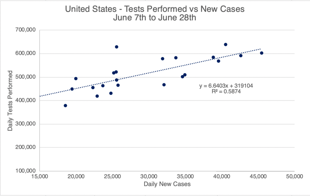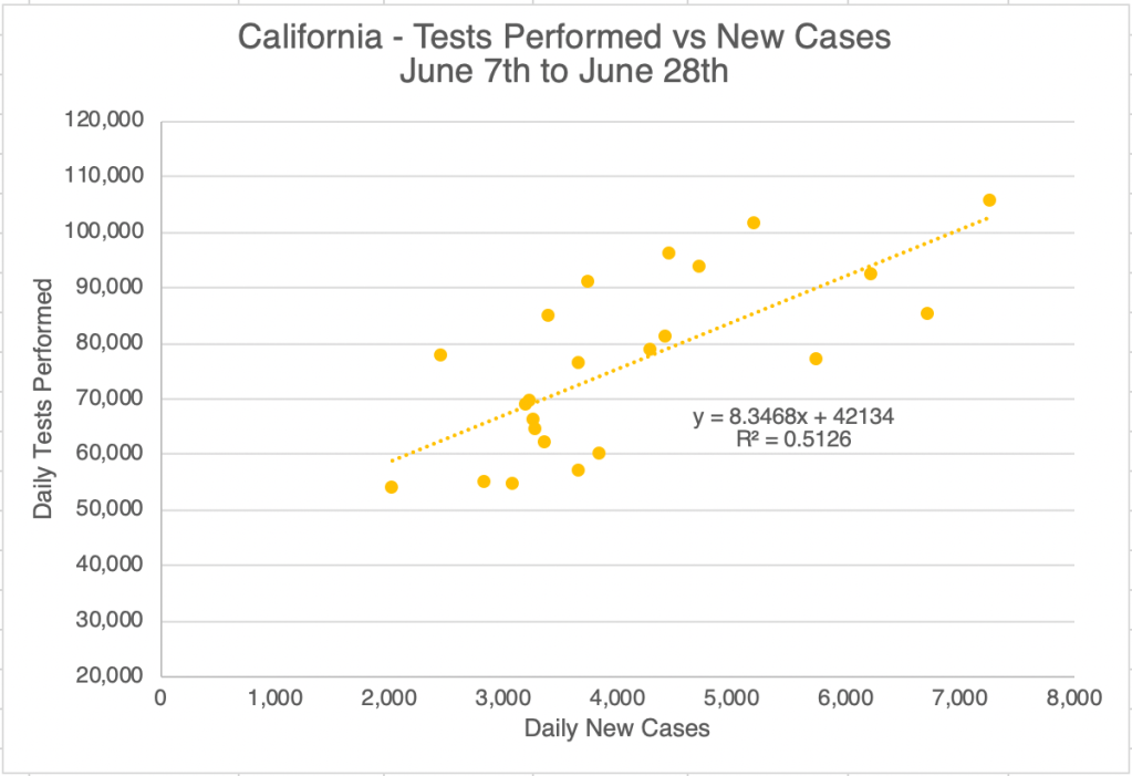 In my May 12 post, I explained how you can tell if testing is having an impact on confirmed cases by graphing daily tests against daily new confirmed cases. In the last few weeks, the R2 number has risen into the 0.5 range for the US and California. An R2 number of 0.95 “proves” correlation, but a number in the 0.5 range suggests some contribution by increased testing. These graphs suggest that increased testing has contributed some of the new cases numbers, but some of the new cases are simply new infections as well.