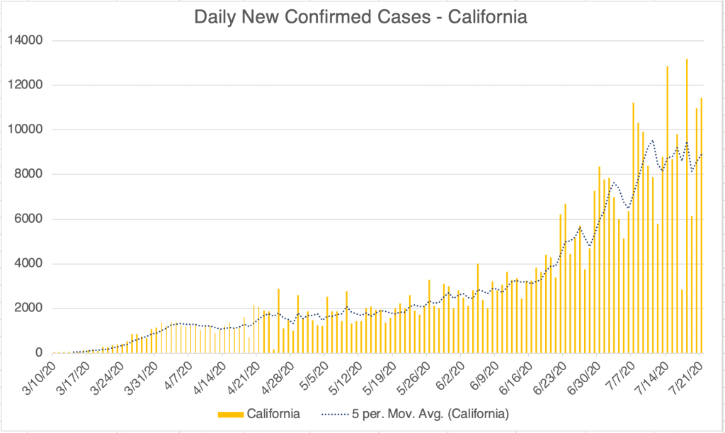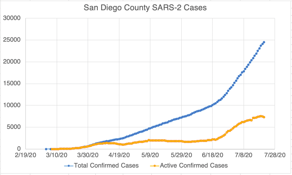 San Diego has been flat since early July. New cases aren’t going down yet, but they aren’t going up anymore either. In addition, the number of active cases in San Diego is probably going down, after a peak of almost 8000 active cases. Unfortunately, California overtook New York for the number of confirmed cases in the country this week, and LA County has the most new cases in the entire country, and has 40% of confirmed cases in California.