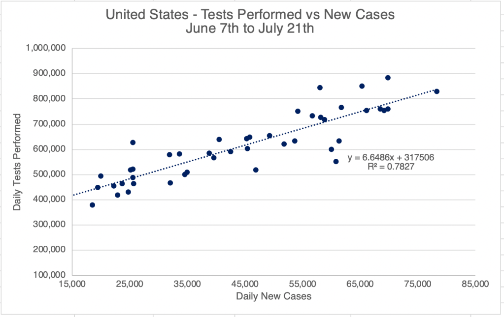 As we discussed in May 12th post on new cases, comparing the number of tests and new cases can tell us if all the new cases are just related to new testing. An R2 number between 0.95 and 1.00 shows strong correlation, “proof” that two things are related. The tests vs cases for the US since early July give an R2 of 0.78. This suggests that though many of the cases are real, at least some are because of new testing. In California the R2 is 0.44, a much weaker relationship, meaning more of the new cases are not just due to more testing.