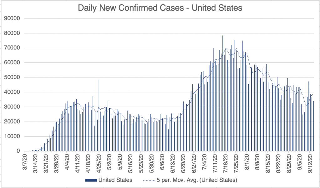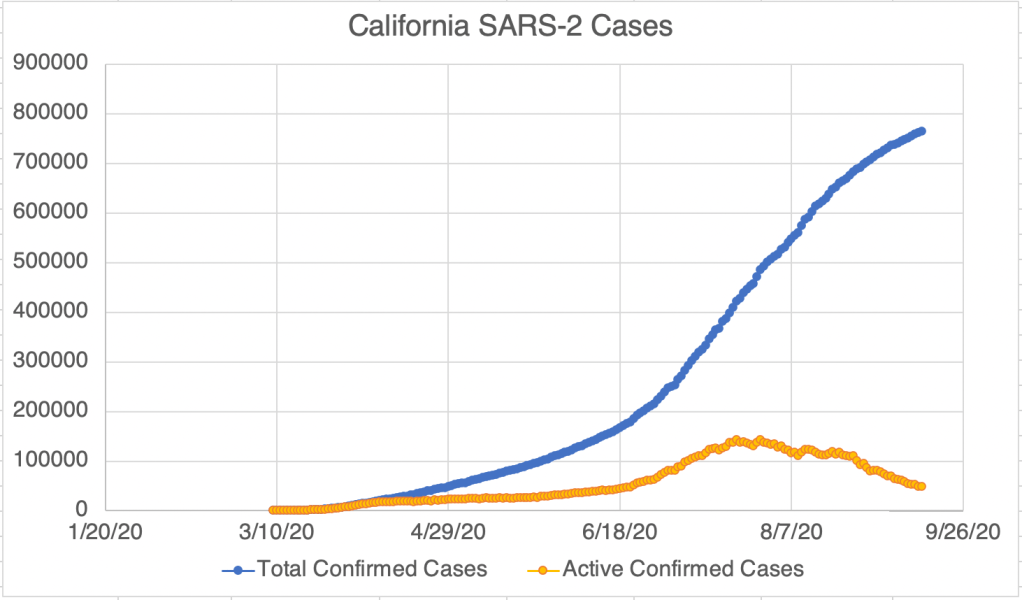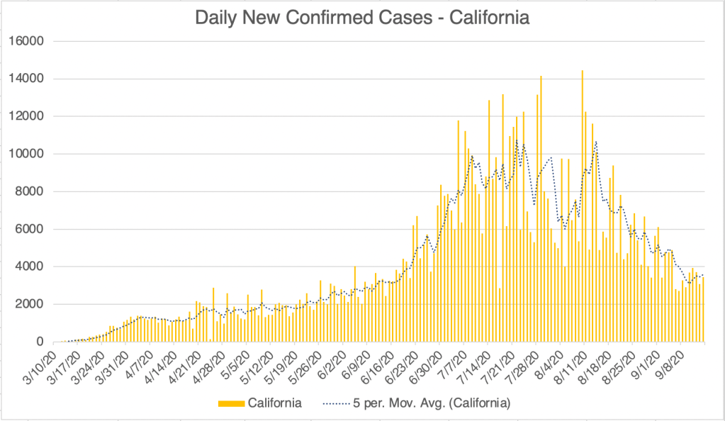 This is a virus update. I’ll also have a few comments regarding the recent Bob Woodward book. New confirmed cases continue to drop for the US, California, and San Diego. California new case numbers are back down to what they were before the 2nd Wave hit in mid June.