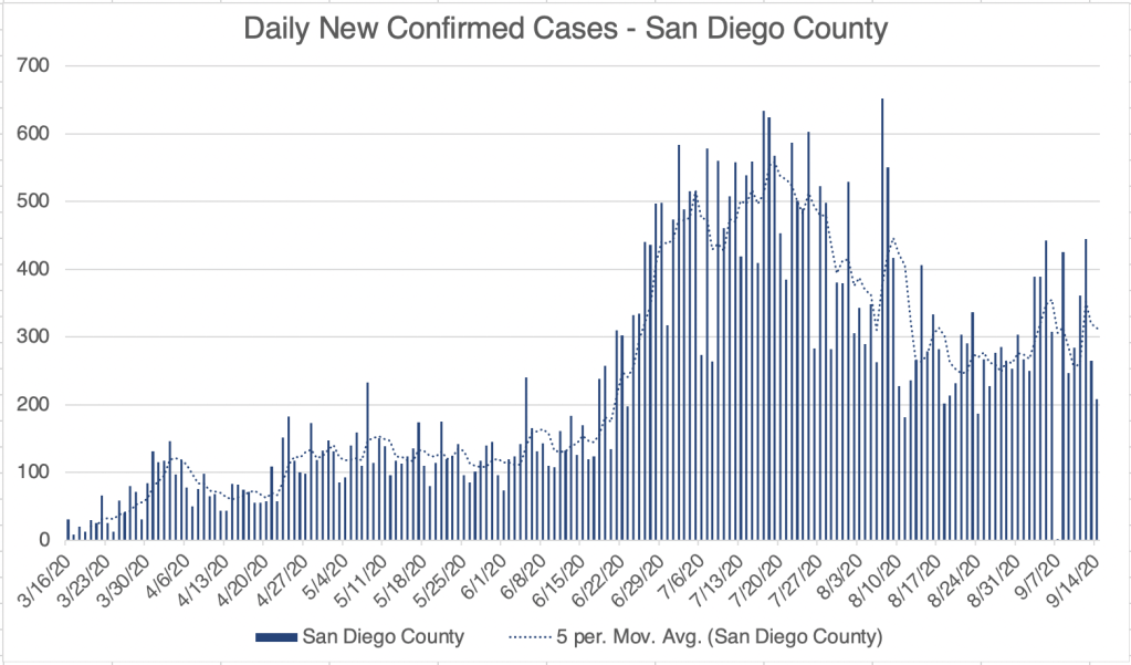 San Diego had a moderate sized outbreak at SDSU in the last few weeks which created a spike in new confirmed cases for the County, but those numbers are coming down as well.