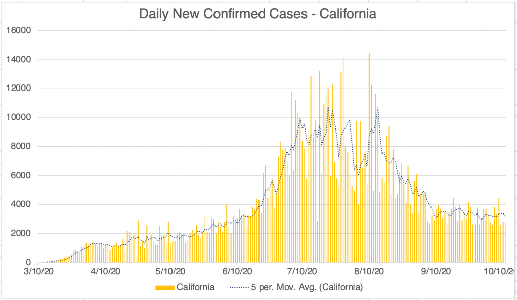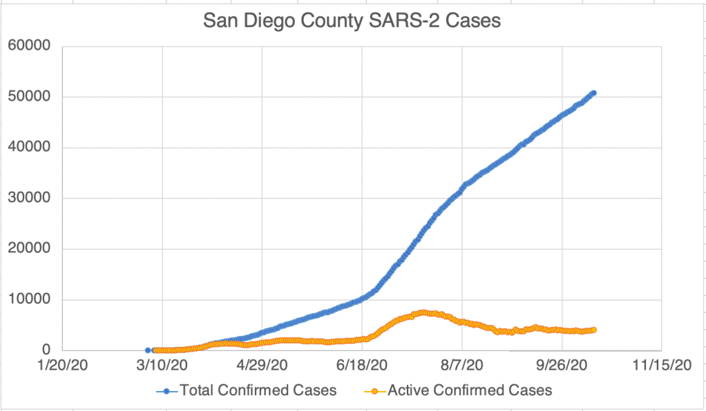 After the end of the 2nd wave, California is experiencing a persistent 3000 new confirmed cases a day, and San Diego County has a persistent 300 new confirmed cases a day. Unfortunately, I’m firmly convinced at this point that COVID may be with us at least until next Spring. As you know if you’ve been reading my posts, I think we will need to adapt to this situation, and open up our economy and normal life as much as possible, while still taking precautions.