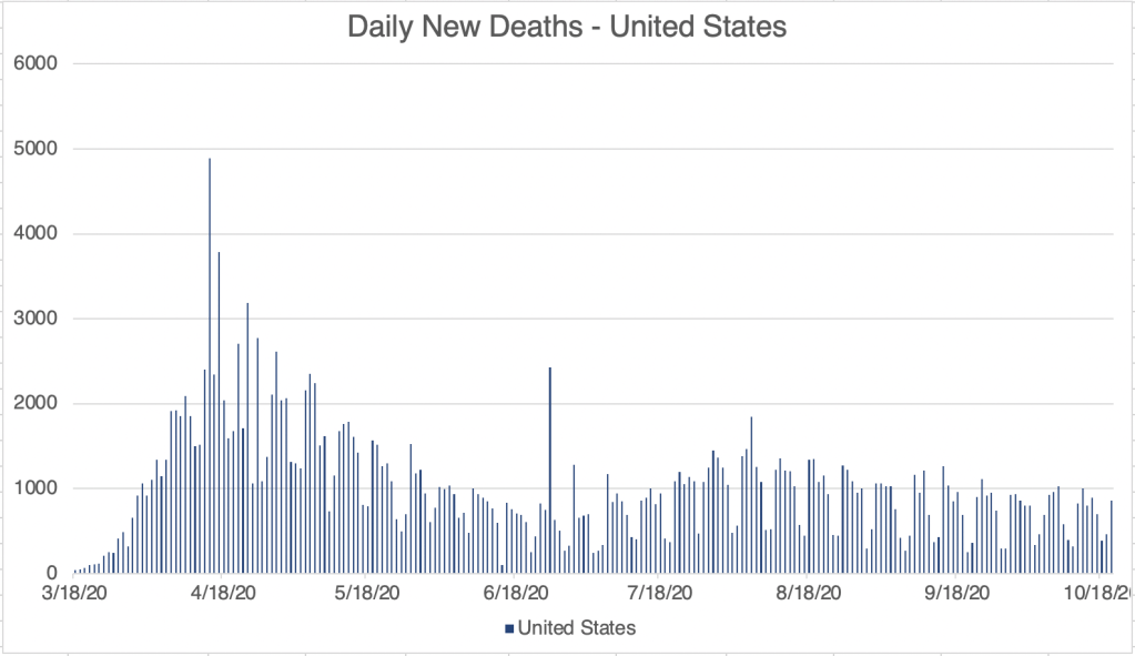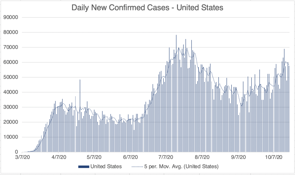 Just a short update today. For the US, new case numbers continue to rise. Most new cases are centered in the Northern states, and new cases are spreading South. My guess is that the cold weather is driving these new cases, as people are spending more time indoors. Despite this, new cases are so far not producing an increase in fatalities.