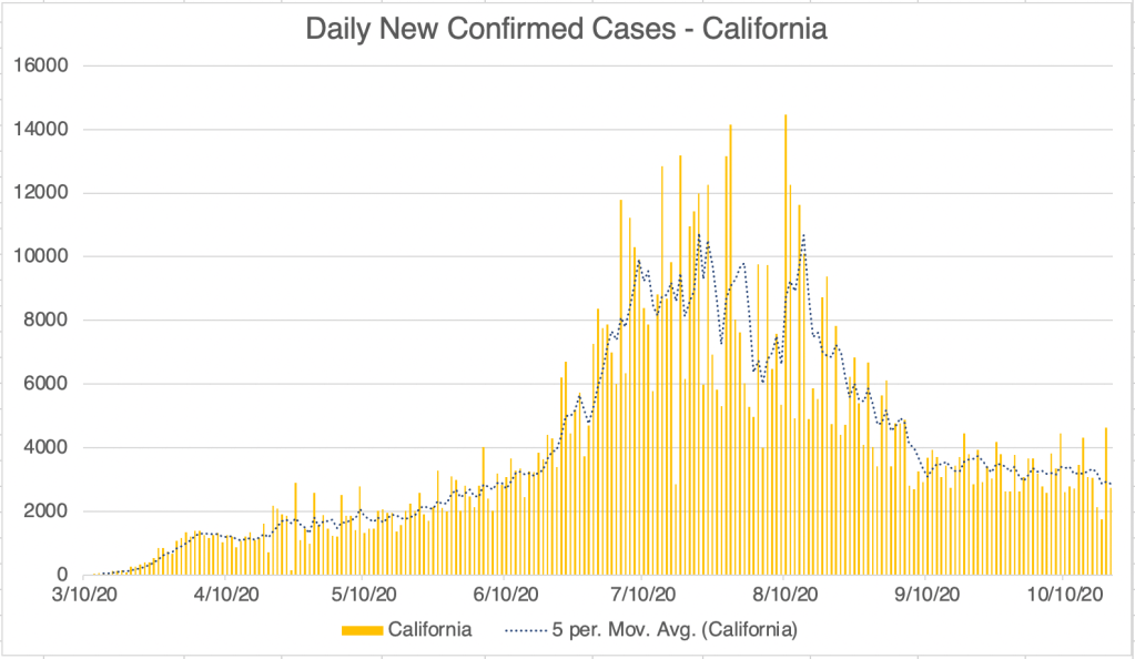 California and San Diego continue to have a persistent number of new daily confirmed cases.