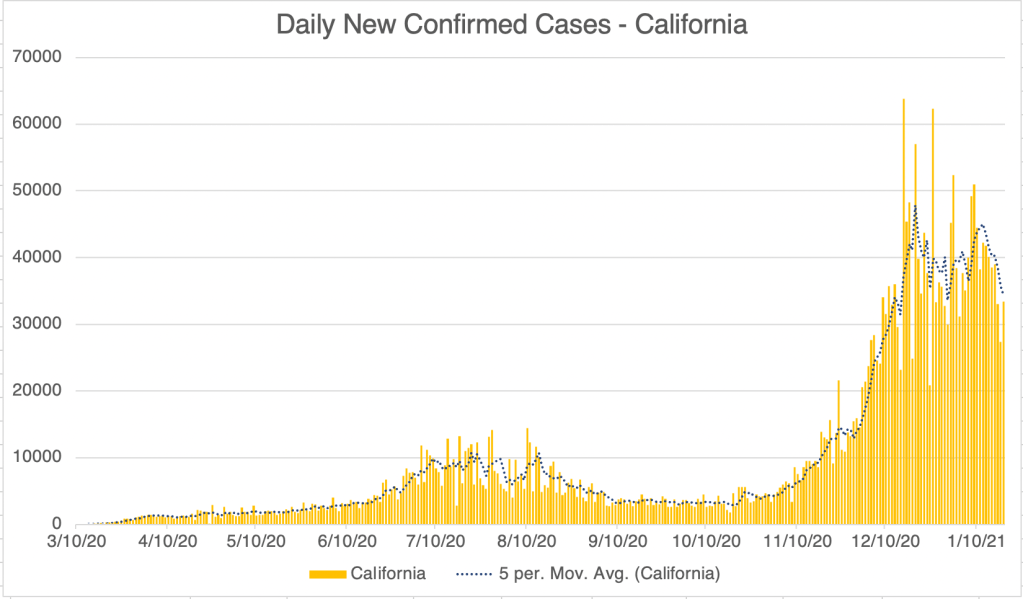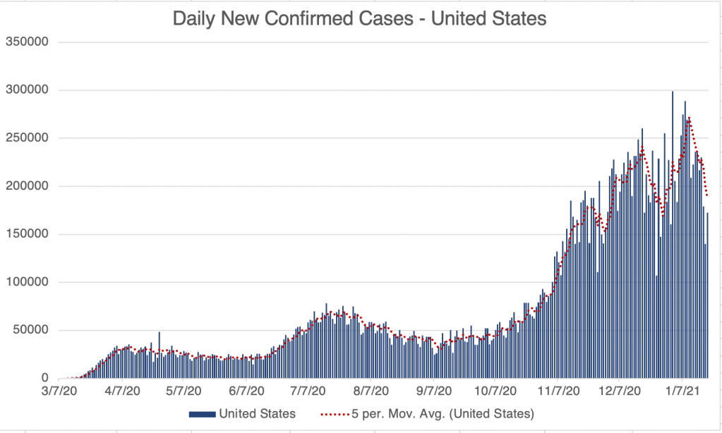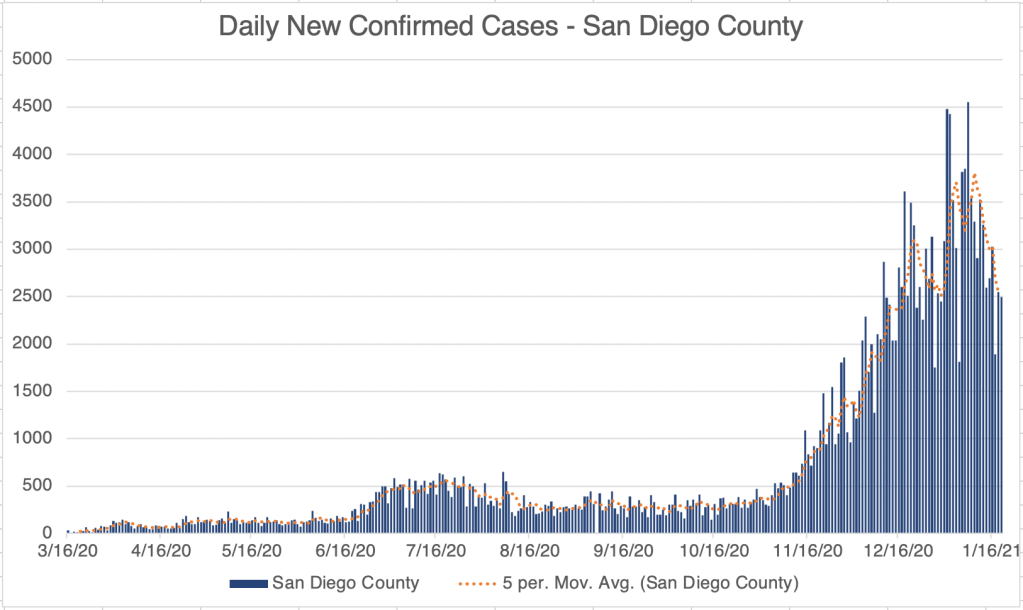 Cases have plateaued and even appear to be falling in the US and San Diego, and perhaps even in California. Hopefully now with no major holidays pending, cases will go down in a significant way. This is just the beginning of a downward trend, and we still need to be diligent. Just because we’re past the middle of the woods, doesn’t mean we’re out of the woods! There are still a lot of new daily confirmed cases.