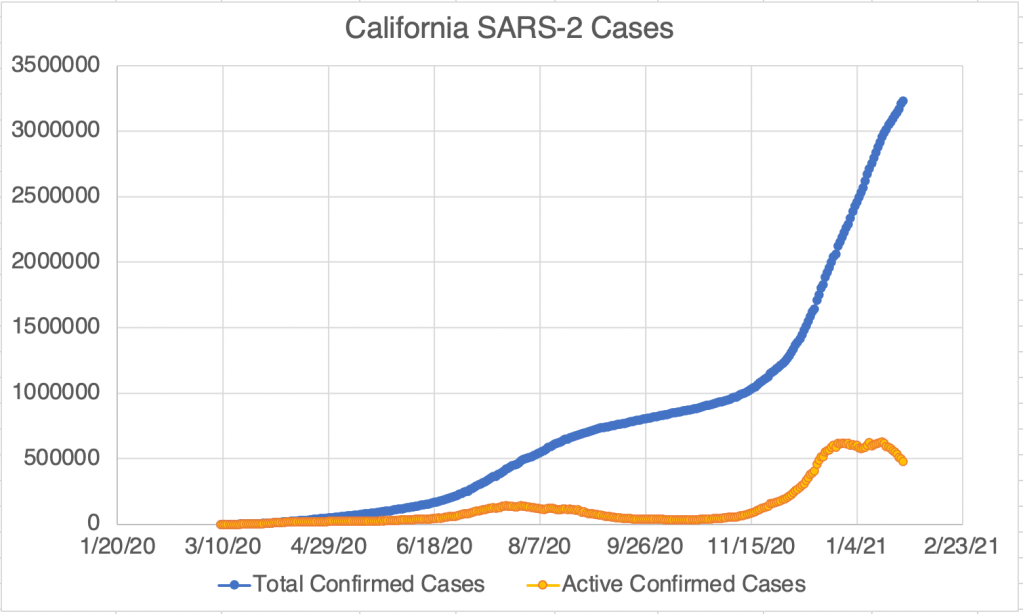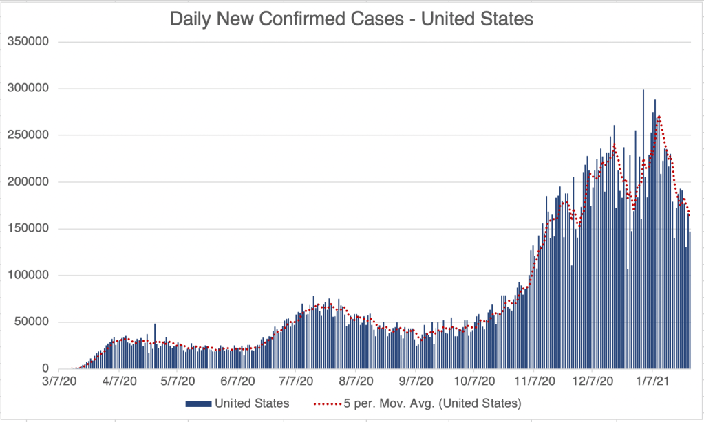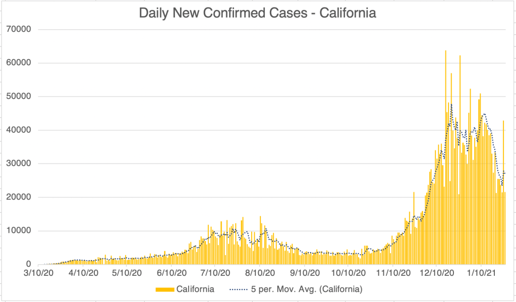 This is a case update. I’ll also briefly discuss some cases of anaphylactic shock in some vaccine recipients. The US, California, and San Diego County are all experiencing a continuing decrease in new confirmed cases! The center of the country seems to mostly have recovered from the 3rd wave according to endcoronavirus, and the coasts are improving as well.