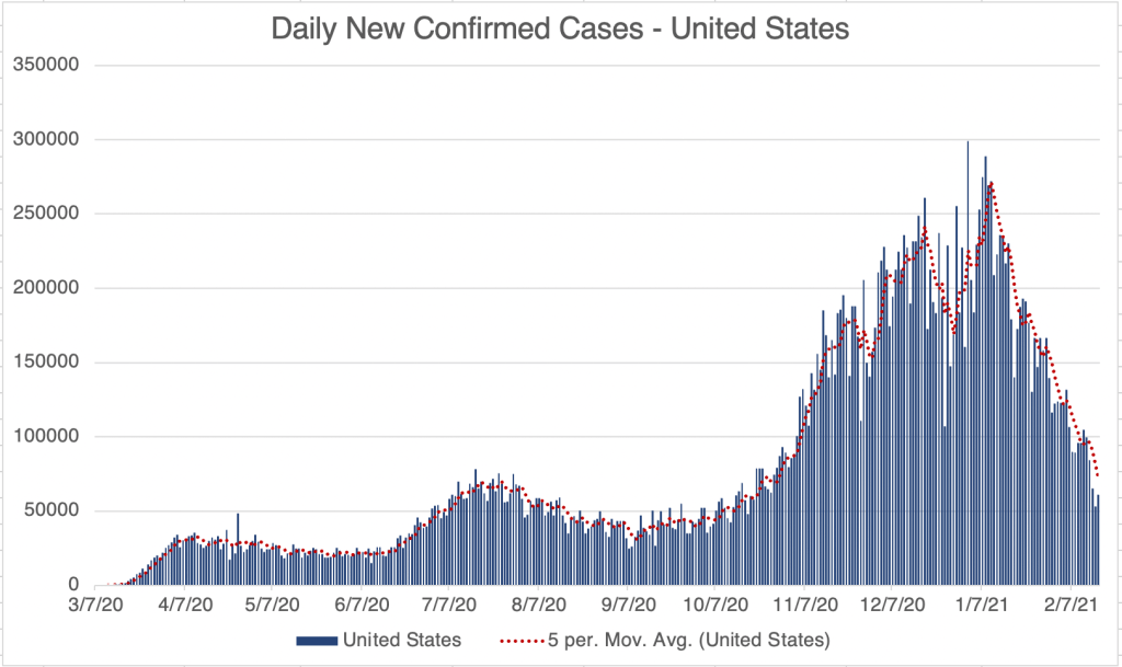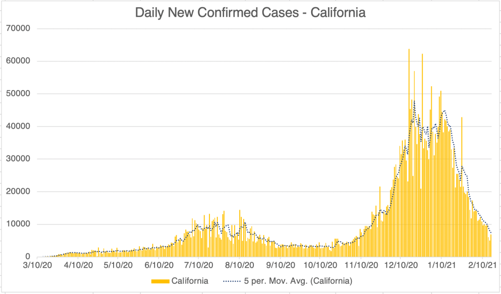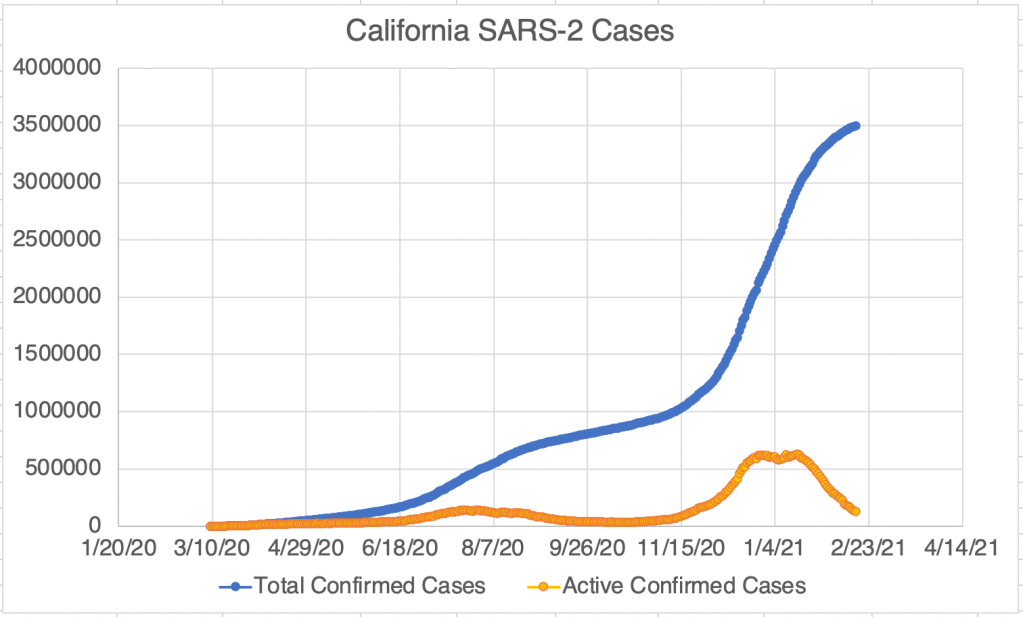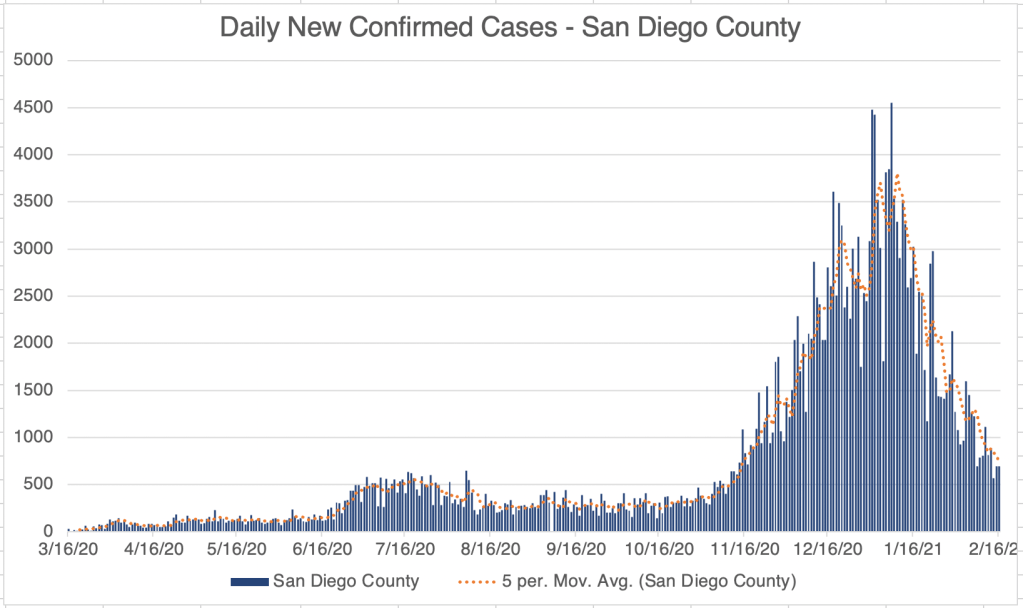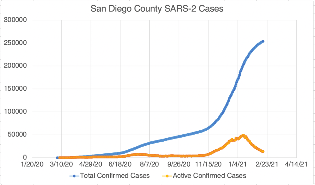 Here’s a short COVID update. New confirmed cases numbers continue to drop for the US, California, and San Diego County. Endcoronavirus show the central part of the country mostly under control, with just a few counties with increasing case numbers. And as a bonus, we didn’t have a Superbowl related bump in cases! Wave 3 is almost over! But we still have significant cases, so continue to be diligent!