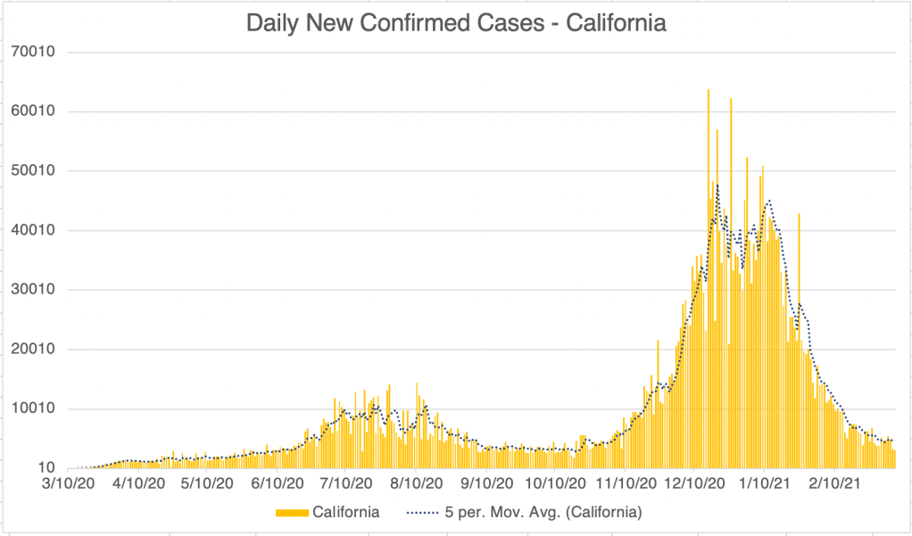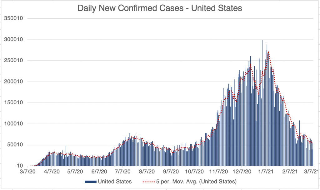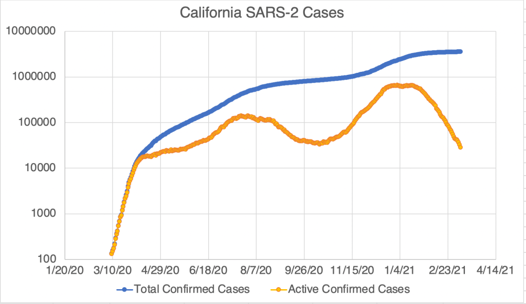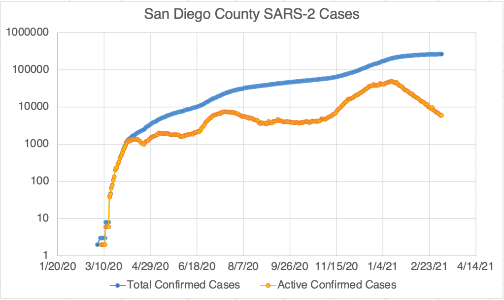 Graph is by me, from data collected from Johns Hopkins University COVID site.Endcoronavirus County Level Map, March 10th, 2021Graph is by me, from data collected from Johns Hopkins University COVID site.Graph is by me, from data collected from Johns Hopkins University COVID site. “Active Confirmed Cases” numbers are calculated based on the assumption that patients confirmed to have SARS-2 virus at least 17 days ago have recovered. Because our new active case numbers are getting low, I’ve switched to a logarithmic view. This emphasizes small values and makes them easier to see. Notice that the case number on the left now go up 10 fold with each higher line on the graph.Graph is by me, from data collected from San Diego County Public Health. See also regularly updated slides from SD County.Graph is by me, from data collected from San Diego County Public Health. See also regularly updated slides from SD County. “Active Confirmed Cases” numbers are calculated based on the assumption that patients confirmed to have SARS-2 virus at least 17 days ago have recovered. Because our new active case numbers are getting low, I’ve switched to a logarithmic view. This emphasizes small values and makes them easier to see. Notice that the case number on the left now go up 10 fold with each higher line on the graph.