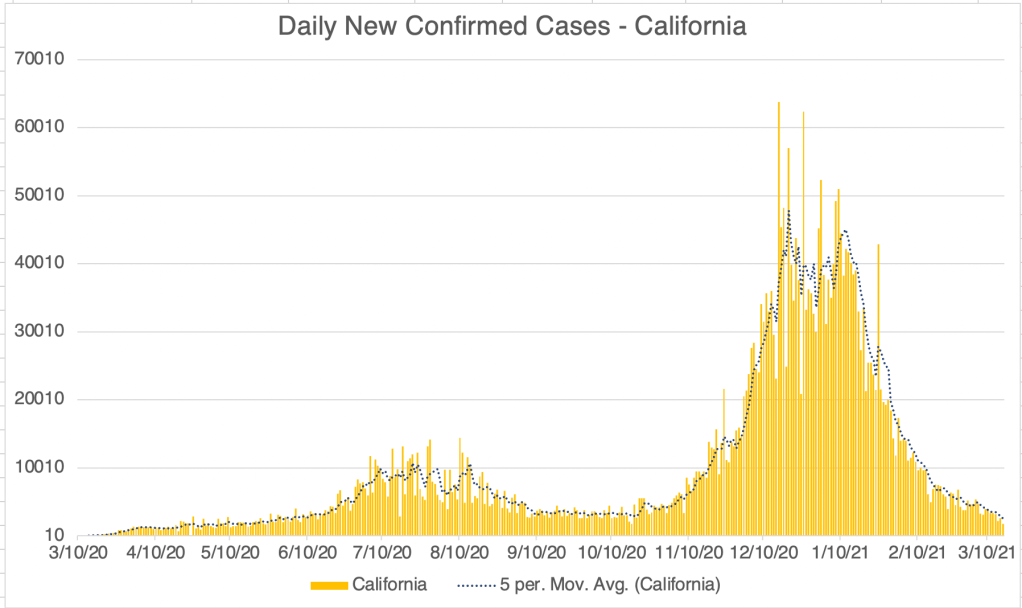 This is a case update. New cases continue to fall for the US, California, and San Diego. There was a spike in cases for the US on March 8th. At the same time, there is a spike in cases in most counties in Missouri. The spike was so consistent across the state, and stops on every nearby state line, that my suspicion is that this represents a reporting problem rather than actual new cases in every county in the state. Sometimes labs or public health departments don’t report on time and allow new case reports to stack up. When they finally report the results, it looks like a big outbreak. I can’t prove that this happened in Missouri, but it’s my suspicion. I couldn’t find any news about this phenomena, and the Missouri state health department shows no spike in cases during this time.