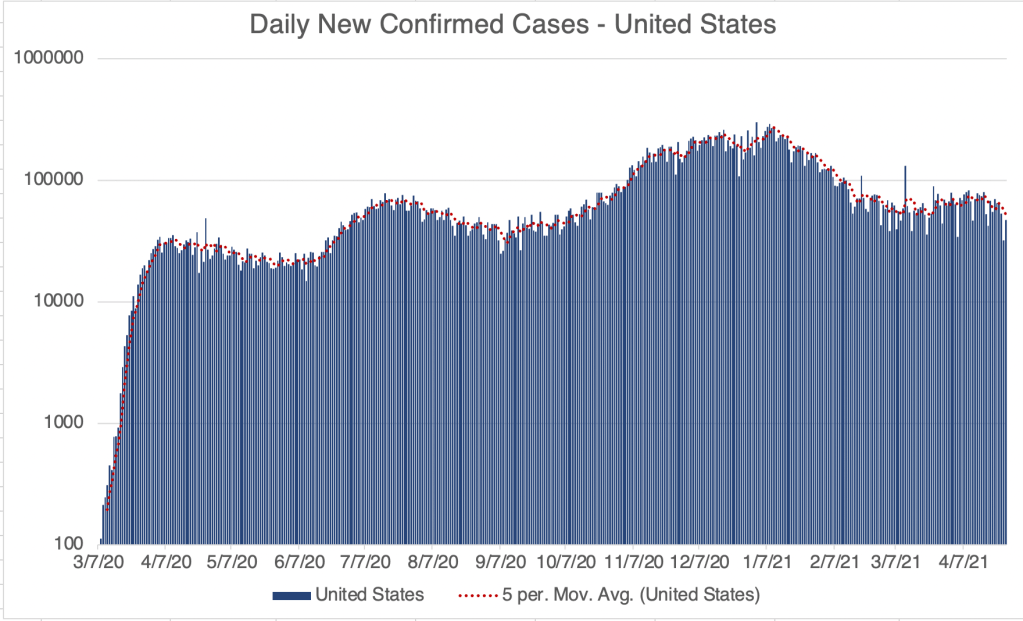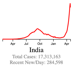 Internationally, a large peak is starting to improve. India has been particularly hard hit by the current wave of cases. The higher cases are likely impacted by the more infectious new variants as well as slower vaccination rates.