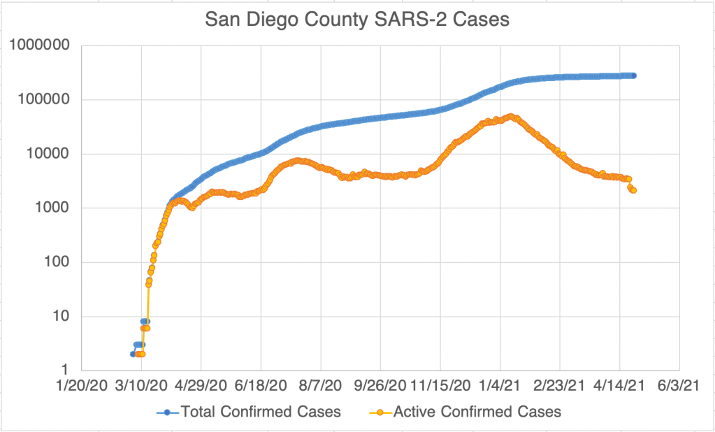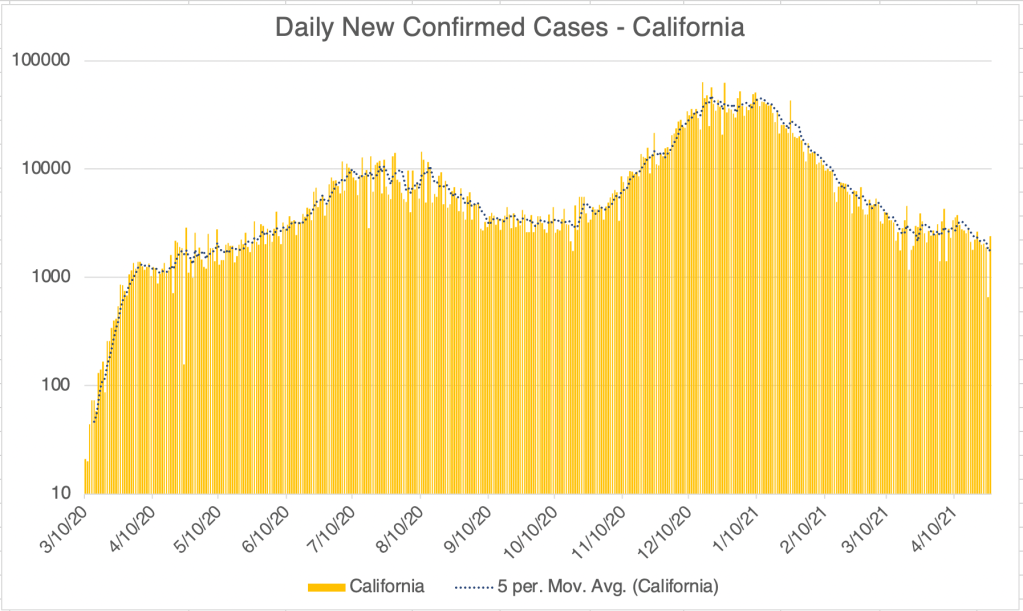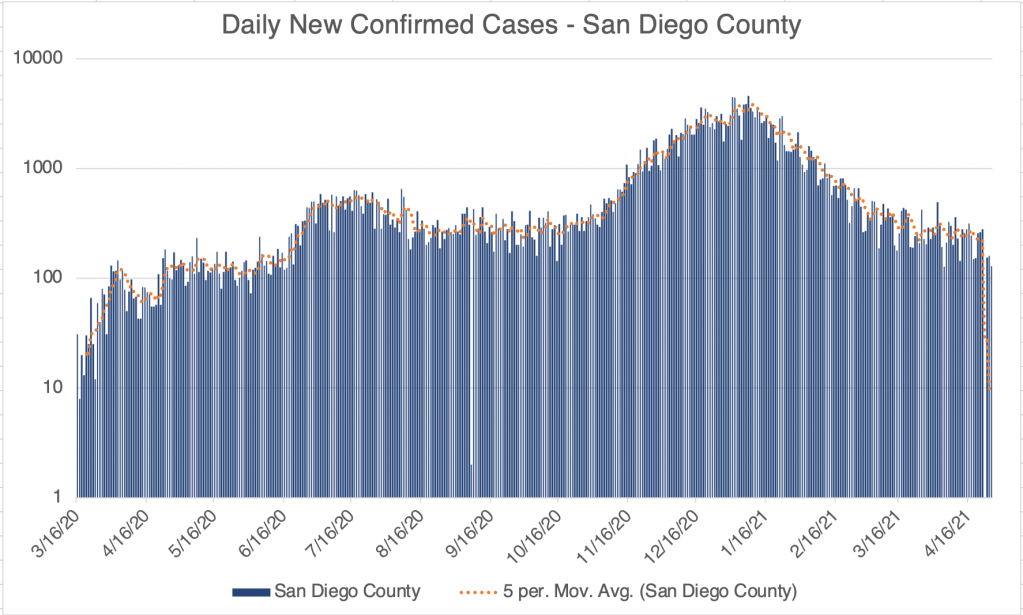 California and San Diego County continue to have fewer confirmed new cases. In fact, California had just 661 new cases on Sunday. The state hasn’t had fewer than 1000 new cases since almost exactly a year ago on April 28th. Yes, Sunday always has the fewest cases of the week, but it does indicate that cases are trending lower.