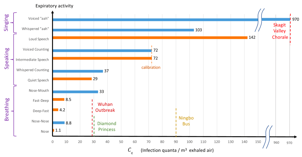 Indoor transmission: Several news outlets have been talking about a new paper on indoor transmission of SARS-2 published by a lab at MIT. It makes several interesting points. First, the paper points out that the Six Foot Rule was designed to mediate infection from large droplets like we see for the flu. Large droplets usually only travel from a person to the ground in 6 feet or less. SARS-2 on the other hand, appears to be transmitted as small droplets in an aerosol. The micro-drops stay in the air much longer and can travel much further. Transmission in indoor settings are a function of the number of people in a space, and the time of exposure. Ventilation helps reduce transmission.