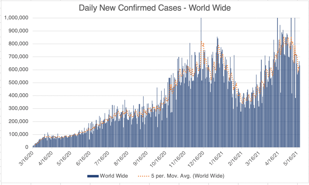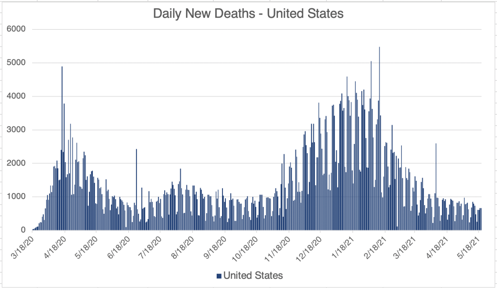 New CDC Guidance: The CDC has been slow from the beginning to update their guidance, often seeming out of step with events. This is not new! They have been like this since at least 2004 when I started working at Quest. They’ve just recommended that fully vaccinated people can go indoors without masks. This is overdue, but many are concerned that they can’t identify who has had the vaccine and who has not. A big change that has happened in the last few weeks is that anyone over 16 who wants a vaccine can now get it. This means that instead of being concerned about behavior of others, you can simply get vaccinated and be reasonably certain that either you won’t get the virus, or if you do, you will have mild symptoms. Yes, it’s true that a few vaccinated people have gotten infected, but this is rare. So I’m now in favor of making masks indoors voluntary.