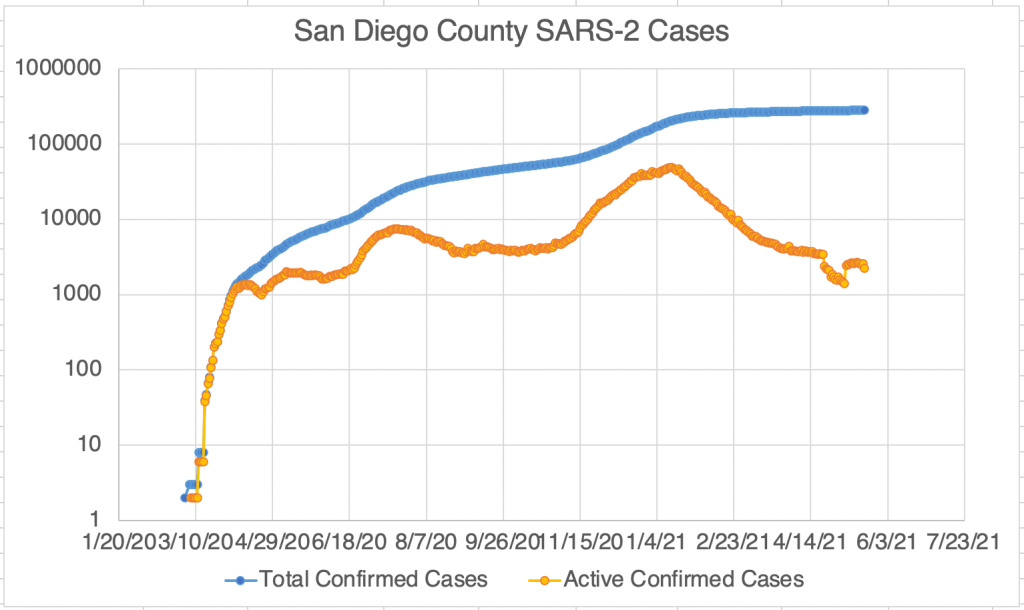 New case numbers continue to fall in the US, California, and San Diego County. Numbers now appear to be as low as they were last March when everything blew up here. In fact, since we have so much more testing now, it’s likely that our actual new case numbers are likely much lower than they were last March.