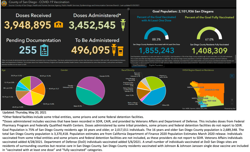 In San Diego County, 42% of the population has been fully vaccinated, and 55% have had at least 1 dose.