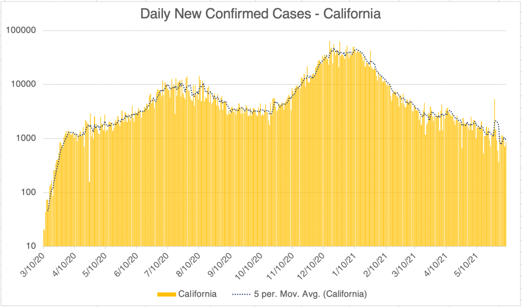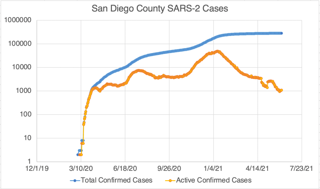 This is a COVID case update. New case numbers for the US, California, and San Diego County continue to steadily drop. In particular, San Diego County has seen fewer than 100 cases in a single day reported 15 times in the last 2 weeks. Also, California has had several days with less than 1,000 cases, and the US has had several days with less than 10,000 cases.