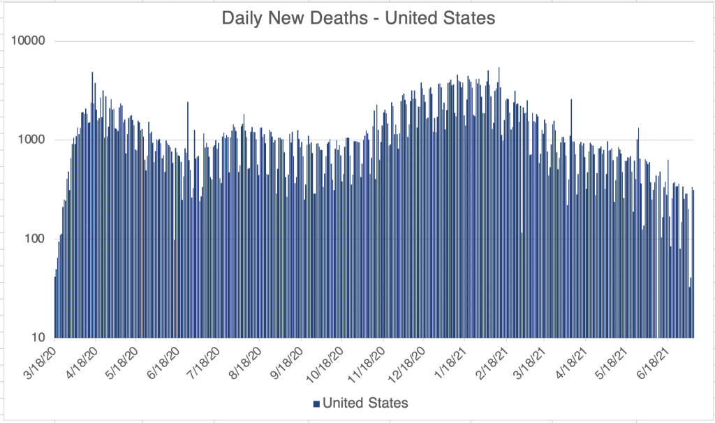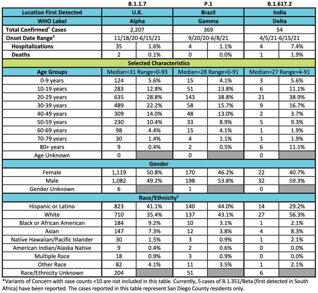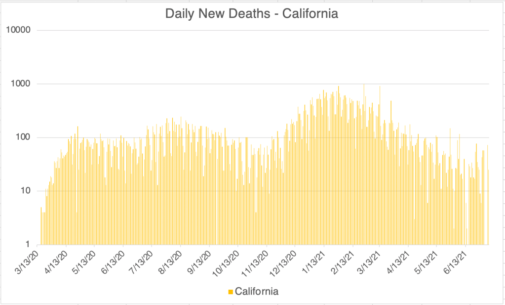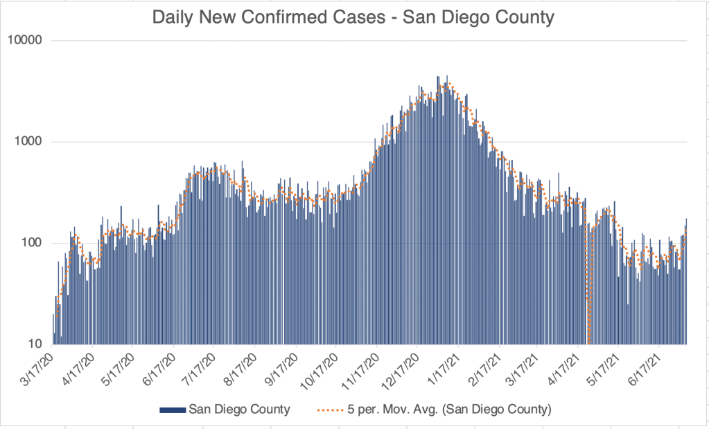 Graph is by me, from data collected from Johns Hopkins University COVID site. Graph is presented in a logarithmic format to emphasize small numbers. Note that each number on the left is 10x higher than the one below it.Graph is by me, from data collected from Johns Hopkins University COVID site. Graph is presented in a logarithmic format to emphasize small numbers. Note that each number on the left is 10x higher than the one below it.Endcoronavirus County Level Map, July 7th, 2021Graph is by me, from data collected from Johns Hopkins University COVID site. Graph is presented in a logarithmic format to emphasize small numbers. Note that each number on the left is 10x higher than the one below it.Graph is by me, from data collected from Johns Hopkins University COVID site. Graph is presented in a logarithmic format to emphasize small numbers. Note that each number on the left is 10x higher than the one below it.Graph is by me, from data collected from San Diego County Public Health. See also regularly updated slides from SD County. Graph is presented in a logarithmic format to emphasize small numbers. Note that each number on the left is 10x higher than the one below it. Numbers are now reported only weekly. While total numbers are accurate, daily numbers are extrapolated from weekly reported numbers.San Diego County COVID-19 Variant Case Summary, July 8, 2021.