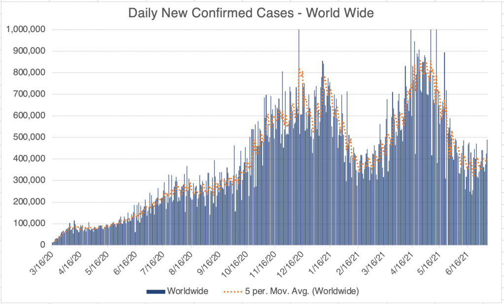 This is a case update. Reporting has become erratic in the last few weeks. San Diego County in particular only reports new numbers on Wednesdays now, so we are no longer getting daily new numbers. Also, Johns Hopkins is no longer reporting Recovered Cases, so I can no longer give Active Cases. These disclaimers aside, there has been an increase in cases in the last few weeks. This is almost certainly because of the more infectious Delta/India variant.