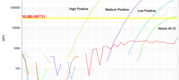 The more starting DNA you have in the reaction, the sooner the instrument will detect a rise in light. Scientists designing the test set a Cycle Threshold (the yellow line in “Real-time PCR Results”). This line is somewhat arbitrary at first, but when the test is validated, it is “set in stone” before being submitted to the FDA for approval. After the threshold line is set, the cycle at which the line of fluorescence for sample crosses the threshold line is called the “Ct value”. As you can see in the graph, the more starting DNA you have, the lower the Ct value is. The lower the starting DNA you have, the later the line will cross the Threshold, and the higher the Ct value.