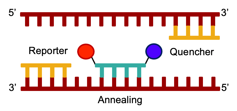 Real-time PCR: Lots of copies of DNA aren’t enough to detect it. You also need something else. Medical detection uses a process called “real-time PCR”. In this process, a third piece of DNA called a “probe” is also added. The probe has a fluorescent molecule called a “reporter” on the front end, and a molecule called a “quencher” on the back. The reporter gives off light during the reaction. The quencher is a molecule that absorbs light and coverts it to heat, effectively dimming the light coming from the reporter.