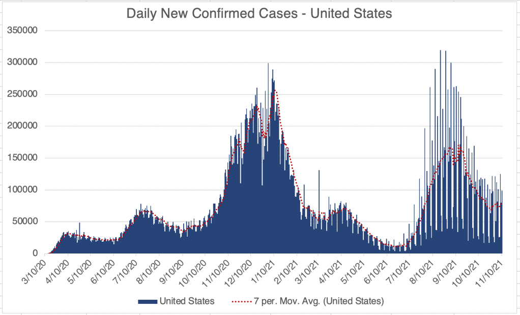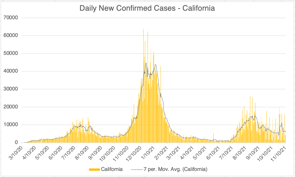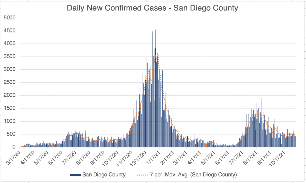 This is a brief case update. For the US, California, and San Diego County, new cases have reached a persistent level. While cases are not going down in these regions, I will point out that last year at this time, we were beginning a big Fall/Winter wave. As of right now, we are not seeing cases rise, but stay steady. So in spite of stable cases, we are not seeing a new Fall wave either. I take this as good news overall.