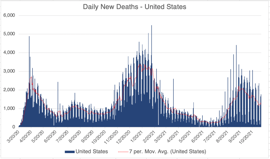 Graph is by me, from data collected from Johns Hopkins University COVID site . Graph is presented in a linear format.