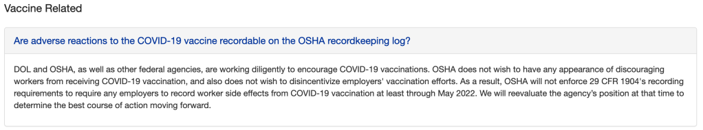 Screenshot from OSHA FAQ on vaccines. Accessed November 23rd, 2021