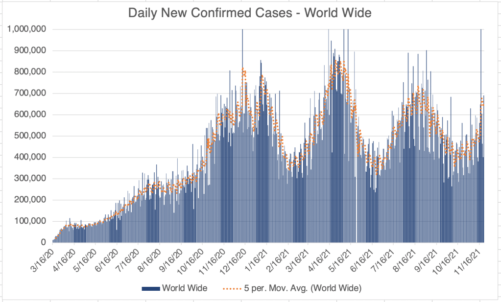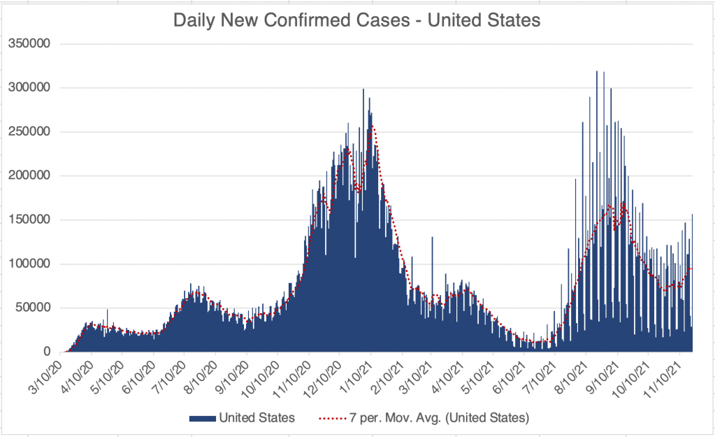 For the US, new case numbers have begun to creep back up.  Several states like Vermont, Minnesota, Colorado, and West Virginia are experiencing increased cases right now.  This is likely at least partly because colder weather is forcing more people inside. Several states are still enjoying decreasing case numbers after the Summer Delta wave, like Oregon, Washington, Alaska, and the Southern states.