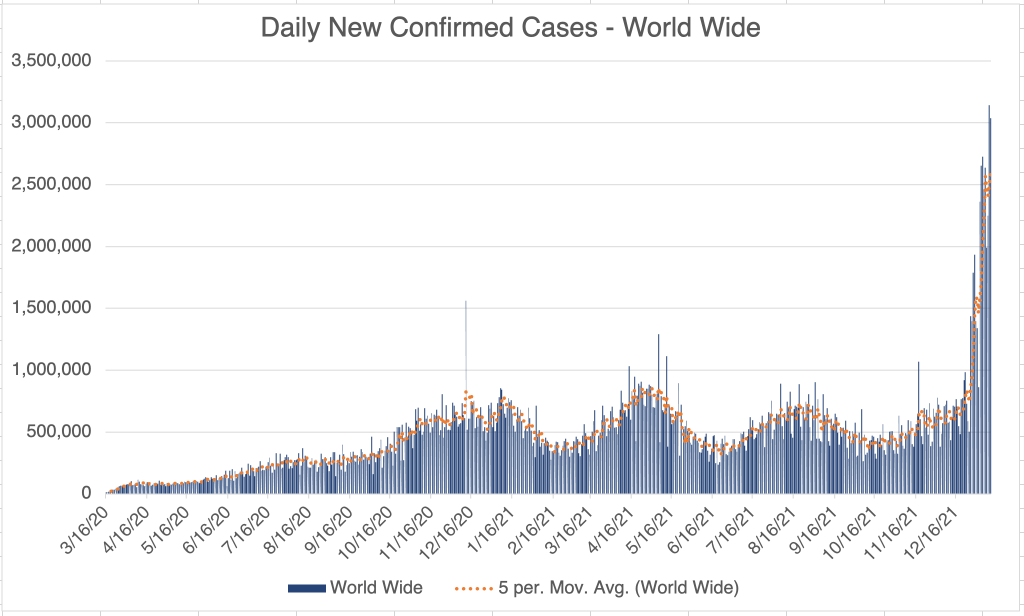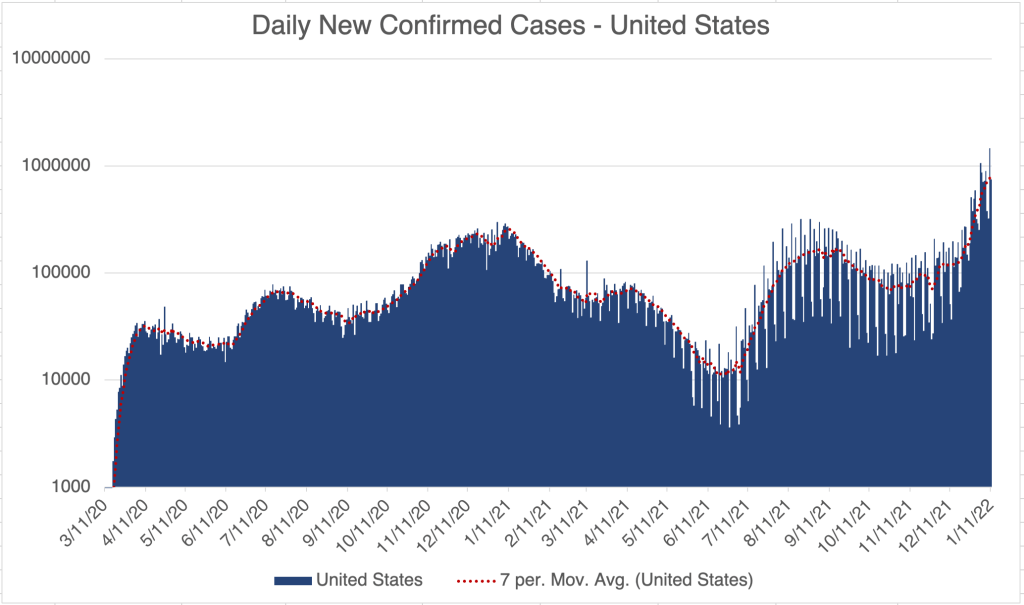 This is a case update. Cases continue be super high in the US. Over the past 2 years, the Sunday numbers are always the lowest of the week, but they also usually predict what will happen to the number in the following week. If you look closely at the case graph for the US, you can easily see the weekend dips in numbers. For this Sunday’s number, the rise in cases is much lower relative to the previous week than the number for the 26th. Because of this, I expect new case numbers in the US to peak this week or next.