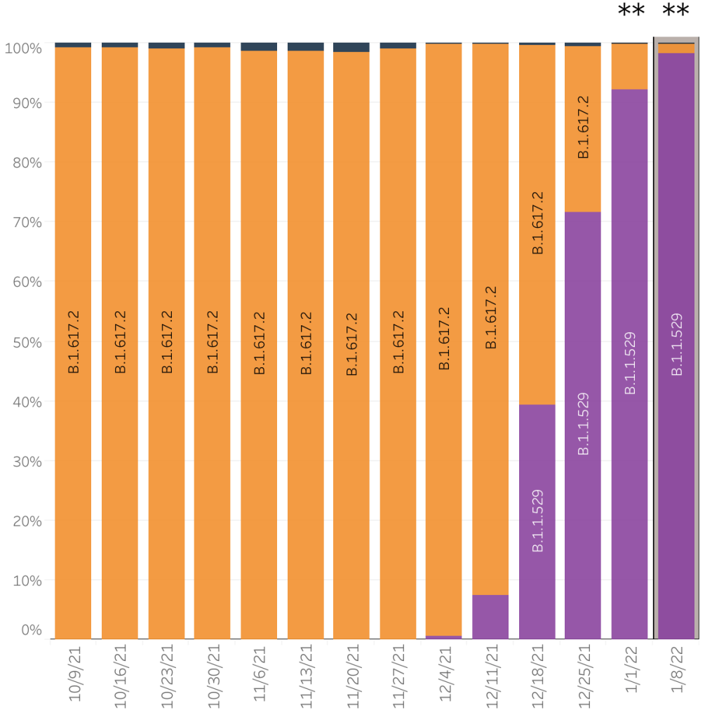 3) Displace Delta: Delta has a much higher case fatality rate in the US than Omicron appears to have. For Omicron to end the pandemic, it must displace Delta from the COVID population of strains. Data from the US and UK suggest this is happening!