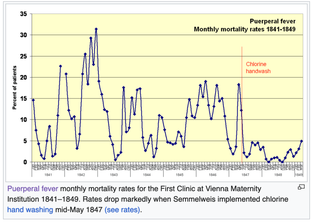 The fascinating yet tragic case of Dr. Ignaz Semmelweis: Ignaz Semmelweis was a physician at Vienna General Hospital in 1847. One of his jobs was to deliver babies in the maternity ward. Unfortunately, in his ward, the rate of fatality for new mothers was high, an average of 18.3%. Women were afraid to deliver in his hospital, and begged to deliver somewhere else!