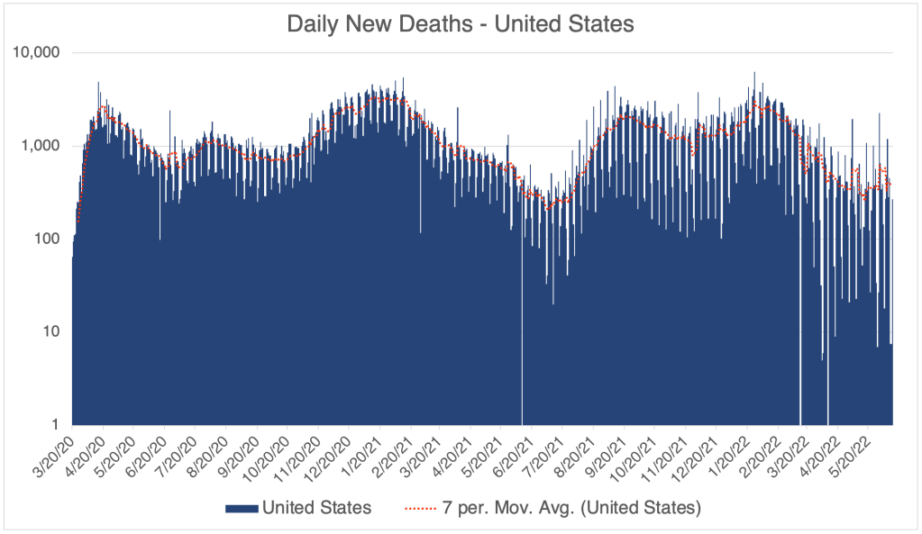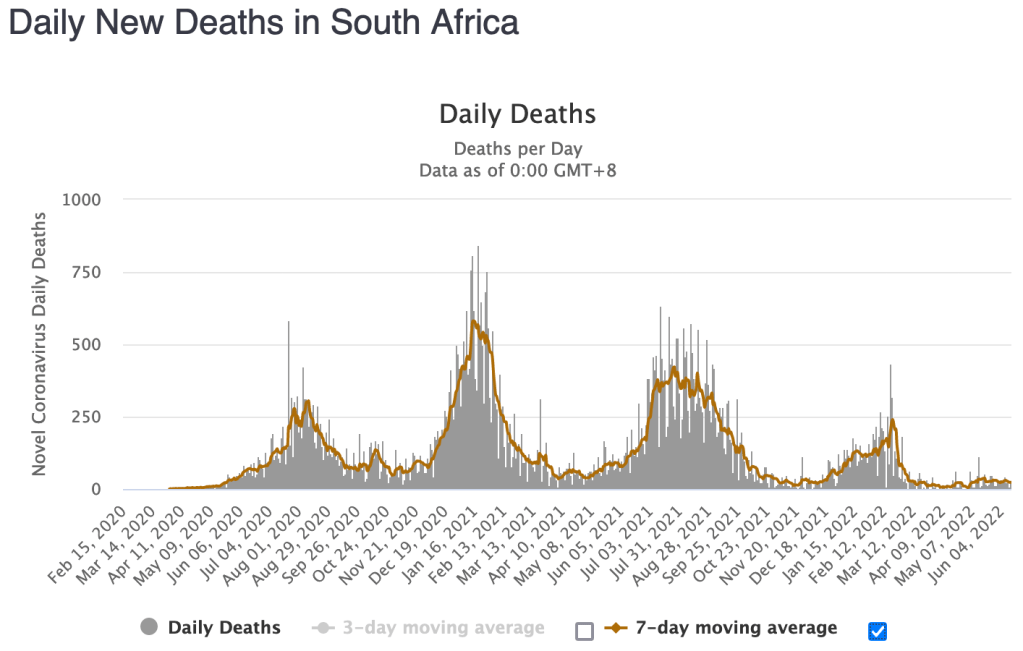 Will we have another peak? Maybe. These variants may have arisen in South Africa, and the BA.4 and BA.5 peak has already come and gone there. The peak was much smaller than the original Omicron peak, and generated even fewer deaths. South Africa did not experience a BA.2 wave of Omicron cases.