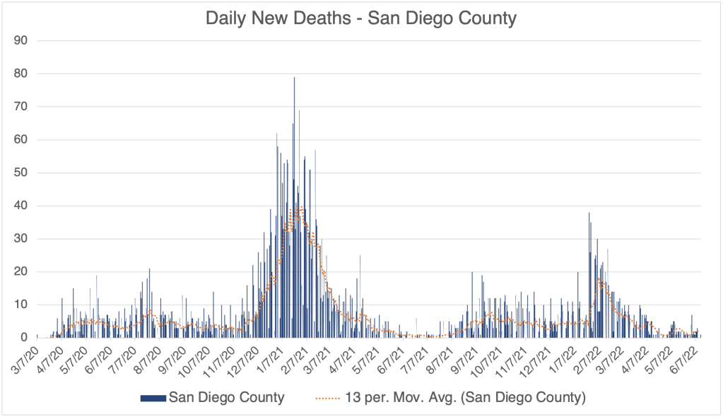 New daily cases have peaked in the US, California, and San Diego. We have yet to see a sustained increase in deaths due to the new BA.2 variant in any of these regions. While new cases have not really started to decrease, the numbers have definitely peaked.
