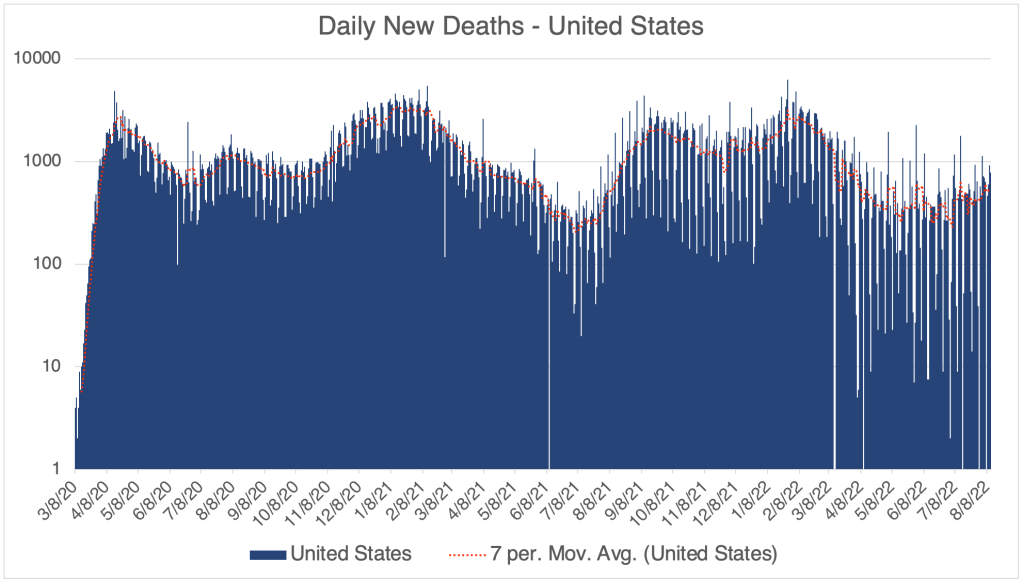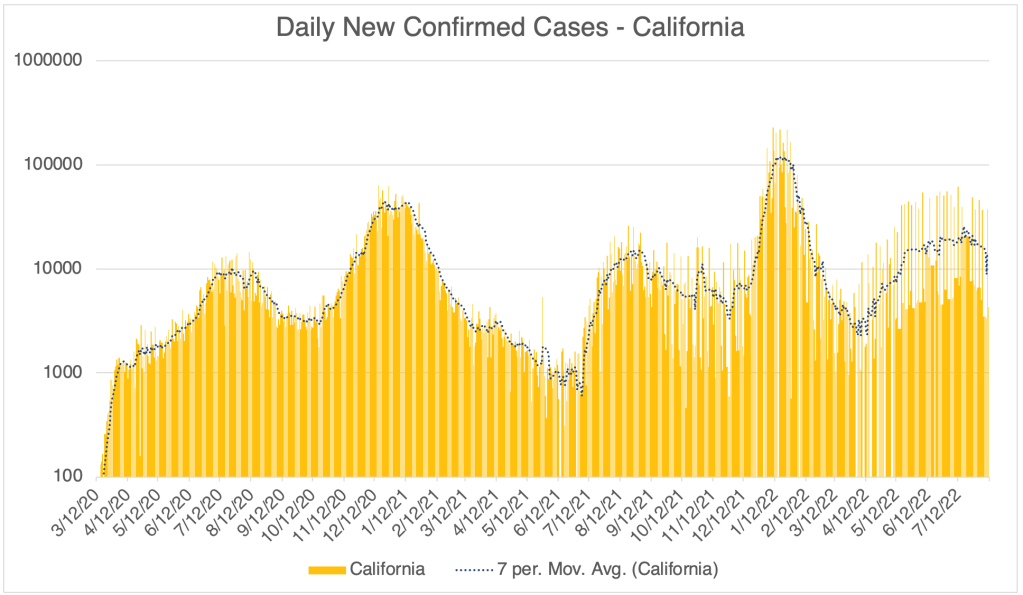 Not much has changed in the last 2 and a half weeks. Cases are still at a moderate level, at least according to official case numbers in the US, California and San Diego County. However, deaths in all 3 regions are still relatively low. This situation has persisted since early May. Even the more dangerous BA.5 has not really produced a large increase in official cases.
