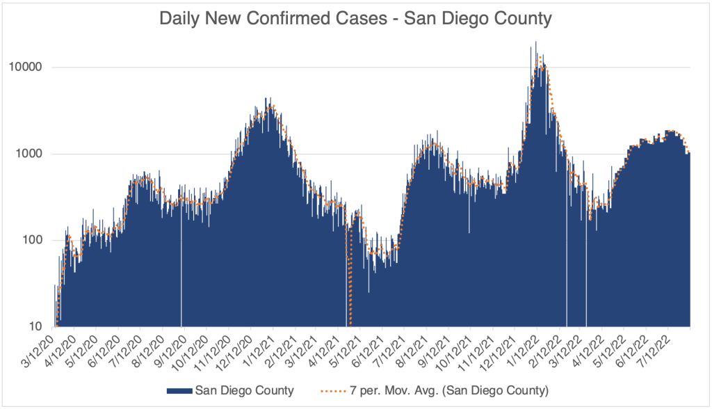 A better measure of case load is hospitalizations. In the US, hospitalizations likely peaked just a few weeks ago, and are now headed down. In San Diego County, hospitalizations likely peaked on around July 10th.
