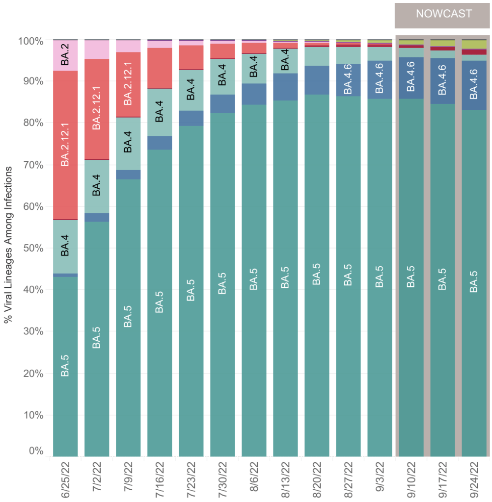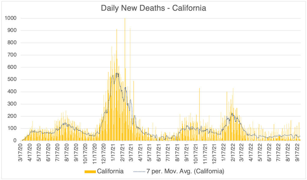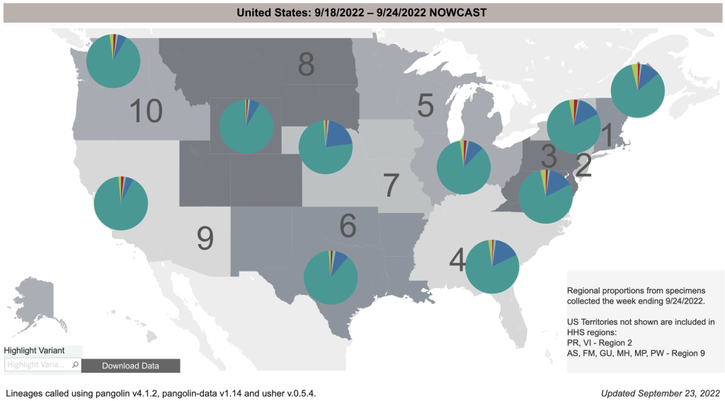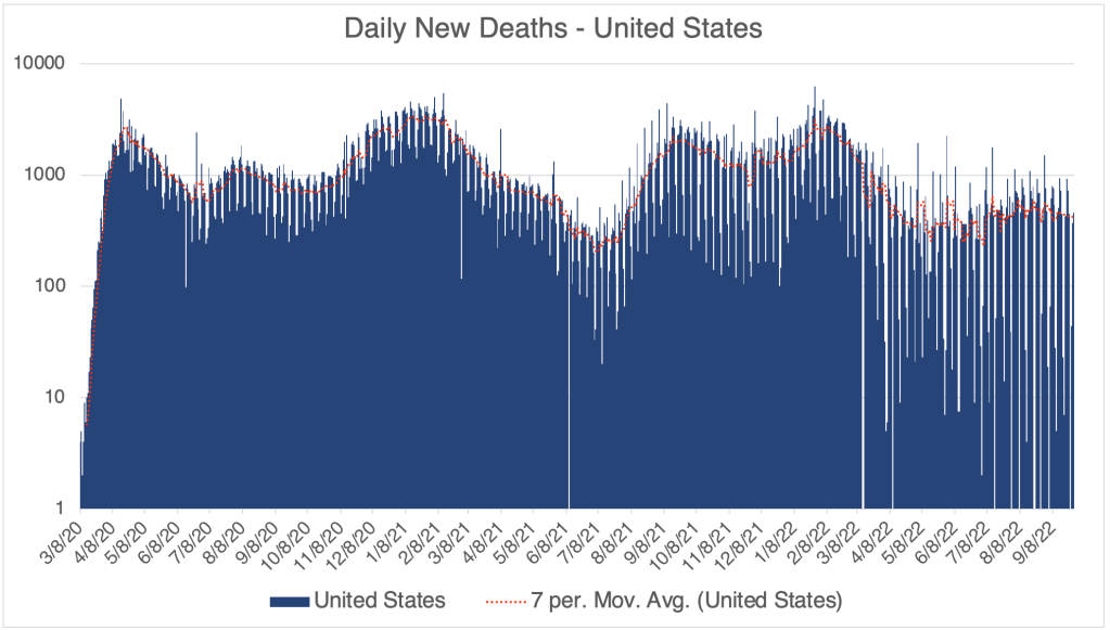 Variants BA.4.6 and BF.7: In my last post, I introduced a new variant BA.4.6. While hospitalizations are down, this new variant is now 11% of COVID cases in the US, and 20% of cases in the Midwest. Still, I don’t think this new variant is likely to have a big impact on the pandemic at the moment, and I expect cases to continue to go down. Deaths remain relatively low compared to the Omicron variant in April after the Winter wave. A newer variant, BF.7, is already growing in prevalence, but so far, there isn’t a lot of news about it.